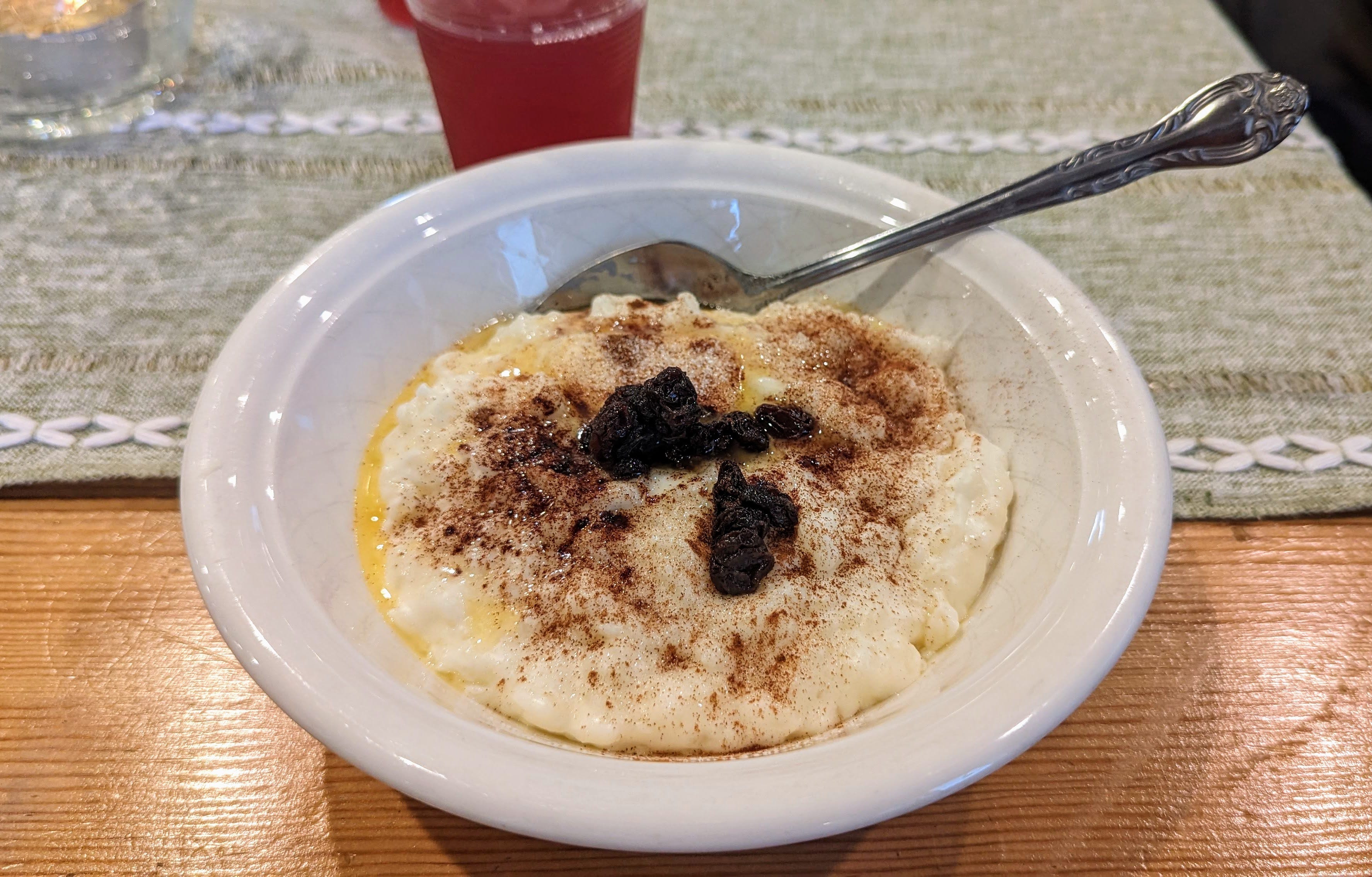 A large pot of Norwegian-style rice porridge is prepared at this time each week, and quite a few people come to enjoy it in the church’s lounge. You can dress up your porridge with butter, sugar, cinnamon, raisins, or a combination of everything. Do not forget to pour yourself a glass of lingonberry juice to accompany your porridge, or whatever is on offer. Apparently it is important to drink “something red” while enjoying your snack.