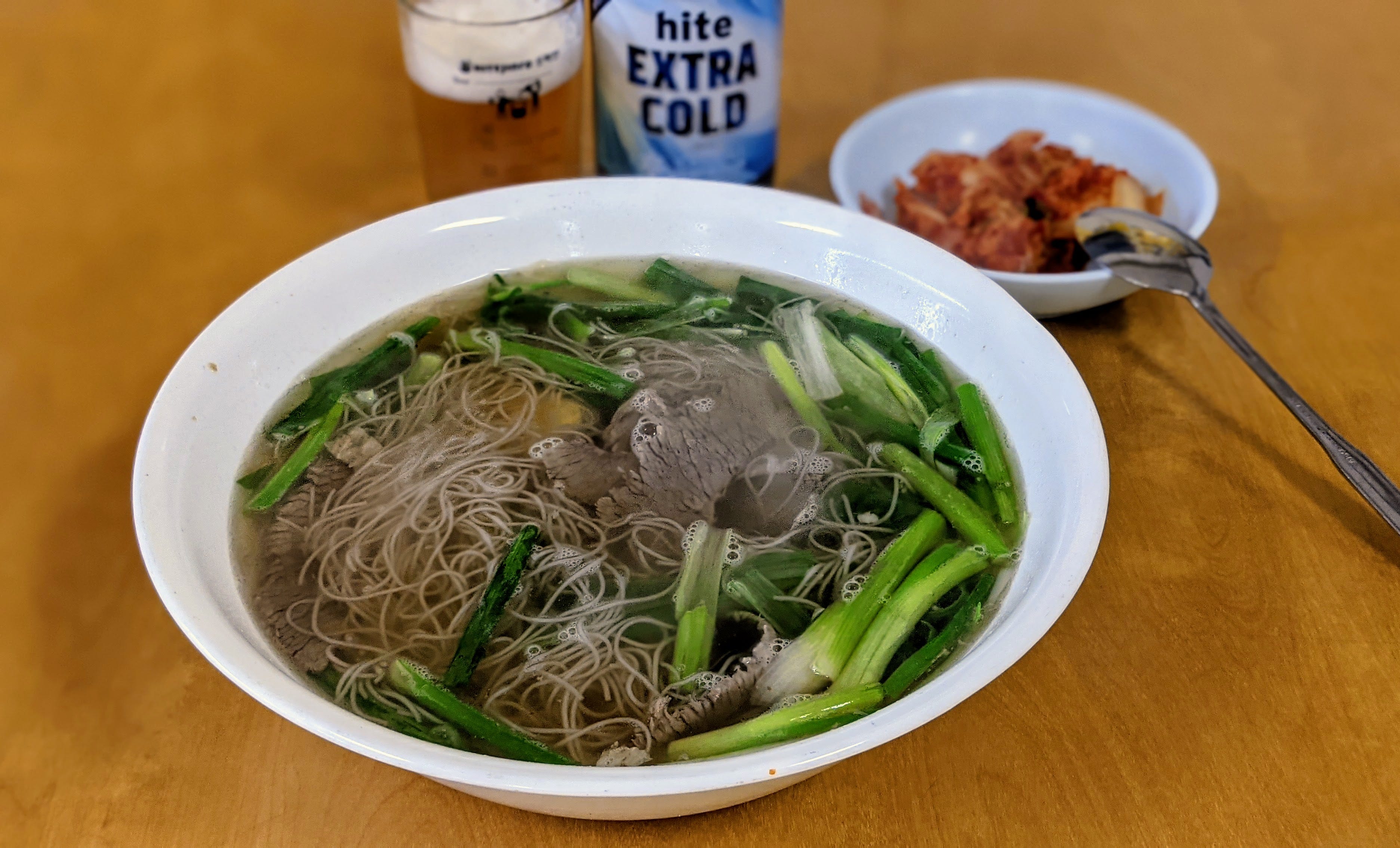 As is customary with spicy naengmyeon dishes, a hot broth will be served alongside your order. At Ham Hung this arrives in a tea thermos and can be replenished as desired. Rather than using this in the bowl, spoonfuls or warming sips on the side can be a good back and forth from the cold spicy noodles.