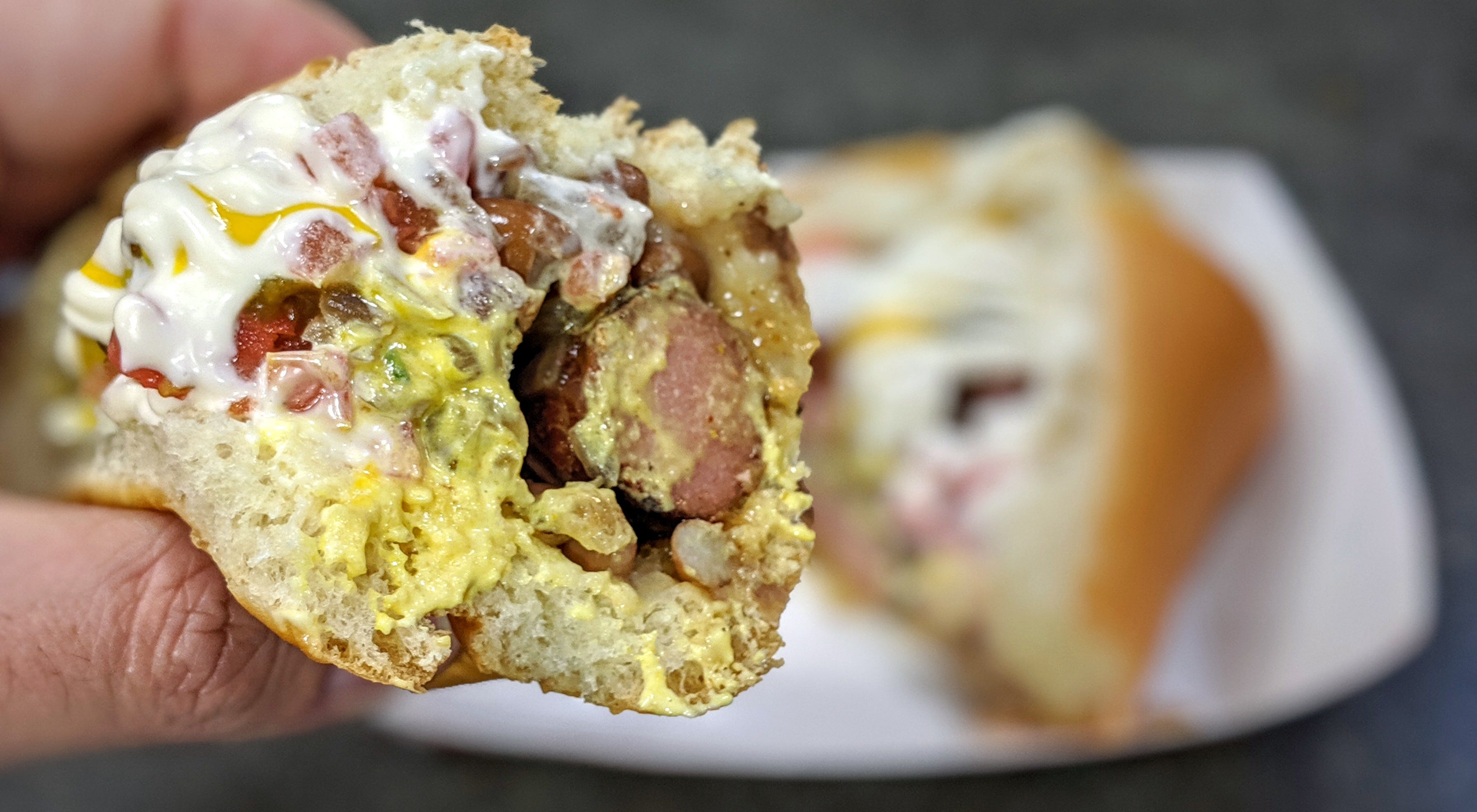 Biting in is at first like putting a delicious pillow into your mouth, and reveals so many components in addition to that bacon-wrapped dog. Pinto beans start to spill out on the plate or table or your pants, as well as onions and tomatoes, mustard, mayo, and their jalapeño salsa.