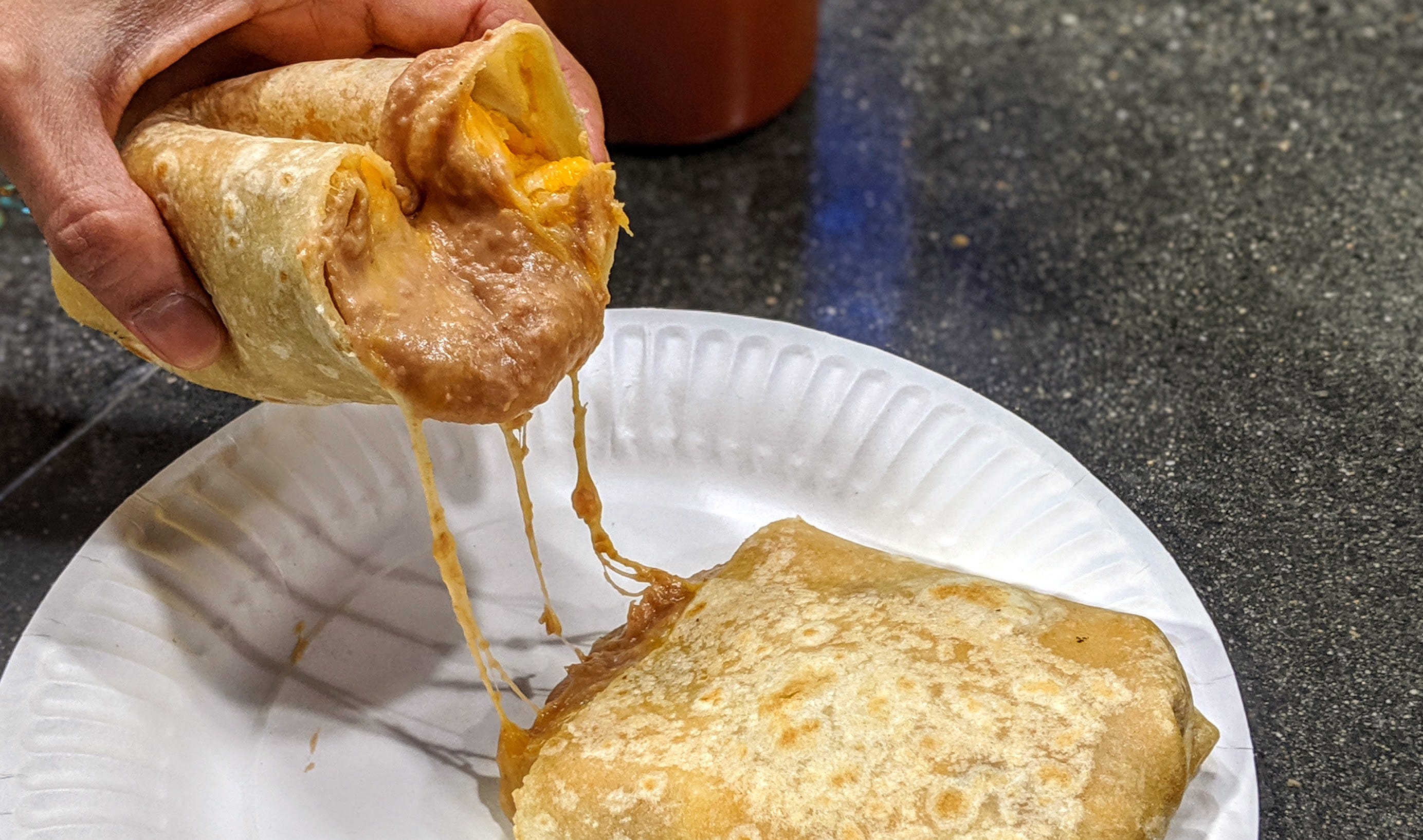 This is a good time to start using that smoky red salsa Sonora, which has a tangy flavor that goes very well with the smoothness of the burrito's three ingredients.